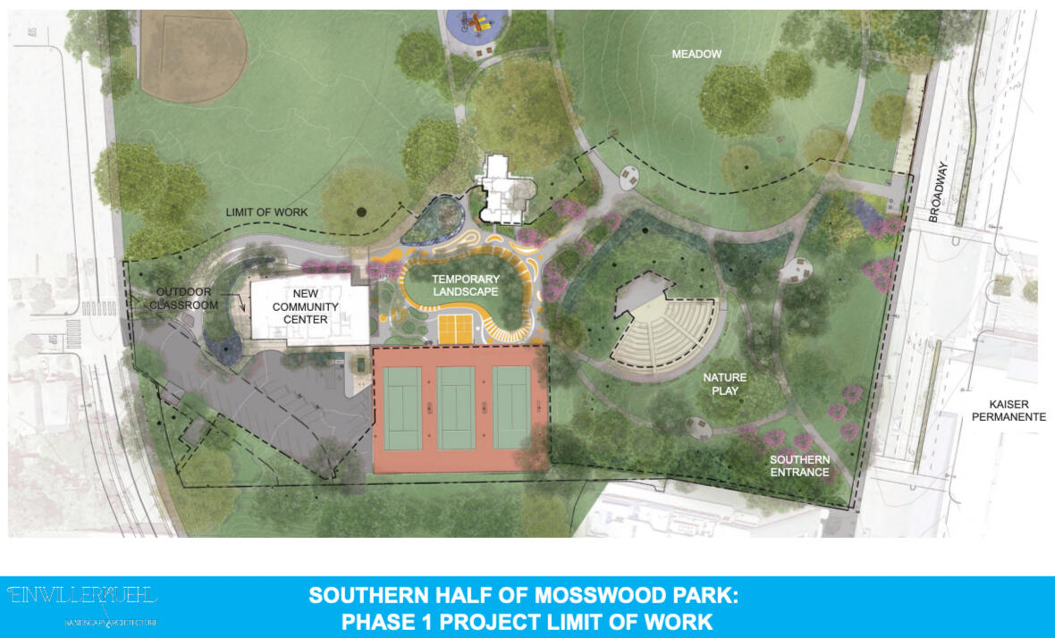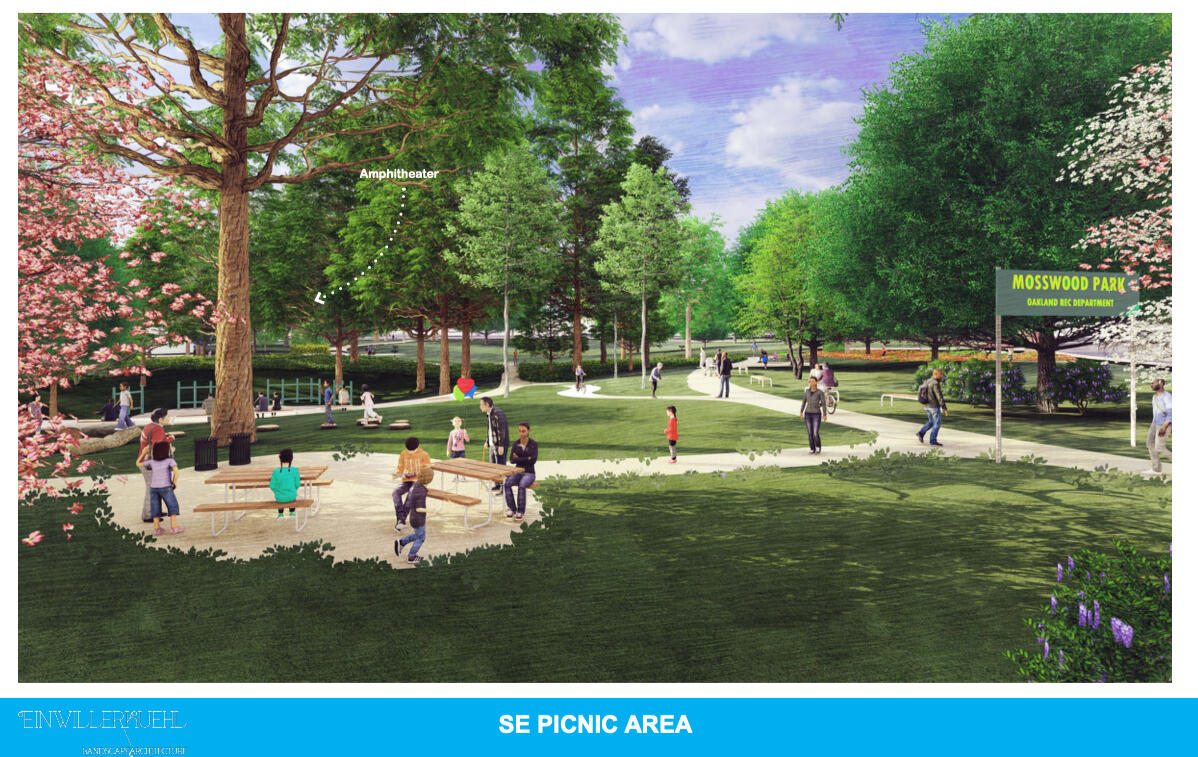A new building is needed (and long overdue)!"Starting in 2019, the City of Oakland worked with community members to develop a Park Master Plan. The design team of Leddy Maytum Stacey Architects (LMSa) with Einwiller Kuehl Landscape Architects lead a series of 6 community meetings. A list of priorities for the park was developed as well as design of a new center. To illustrate its importance to the surrounding neighborhoods, it will now be called the Mosswood Park Community Center.The new Center will be a two story 12,300 square foot (sf) building (replacing the 8,235 sf building) and will re-establish much of the old programing with multi-purpose spaces, staff office, education rooms, and an “inclusion center” for students with special needs. In addition, programs for children and adults will be expanded with a teaching kitchen, social/ dance hall, gallery, and expanded computer center with an “innovation lab” for teaching technology and art. Education and recreation will extend outdoors with 1.63 acres of outdoor improvements (the full park is 10.7 acres). There will be new outdoor event spaces, improved pathways and lighting, and new accessible picnic, ping-pong and chess areas. New plantings will native planting and habitat areas with educational and interpretive signage. All landscaping will be ReScape certified (for Bay friendly landscaping).The new Community Center is designed for the present and the future. The building is designed to achieve LEED Gold certification, is all electric and will be net zero ready. It is about 10% more energy efficient than required by code and with the designed PV system installed it would generate about 75% of its energy needs. Additionally the design reduces the carbon footprint of construction by reducing the use of high embodied carbon materials such as concrete and steel. The main structure of the building utilizes innovative mass timber - a renewable and carbon sequestering material. Reducing the potential carbon impacts of the building address current global warming issues and improves air and water quality in direct relation to the park’s mission of wellness. Reliance on natural ventilation, daylighting, and on-site energy production set up the Community Center to serve as a resiliency center and emergency center in the event of heat waves, earthquakes, or major storm events.The Community Center and related landscape work will have all approvals, permits, and documents ready at the beginning of November 2022. However we lack the funding to complete the project. Currently we are seeking about $12M to complete the Mosswood Park Community Center Rebuild project.The good news is that voters just passed Measure U - a bond which can provide the money to Rebuild the Rec Center. Now we need to push our city officials to prioritize Mosswood. Make your voice heard! Contact city officials and let them know that rebuilding the Rec Center is a priority!